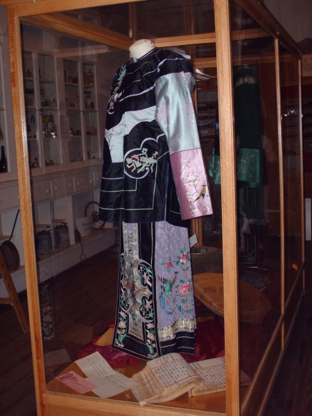 The new Chinese Display features items on loan from Susan Bramson which were brought back from China by her grandfather during the Boxer Rebellion. These include, among others, a two piece silk garment, a headdress, and a pair of red wedding shoes. In addition, two interesting pieces on display, found locally, are a bronze turtle and a wading bird which symbolize long life. They were traditionally given as wedding gifts. These were donated to the museum by former residents Chuck and Marna Shirley.